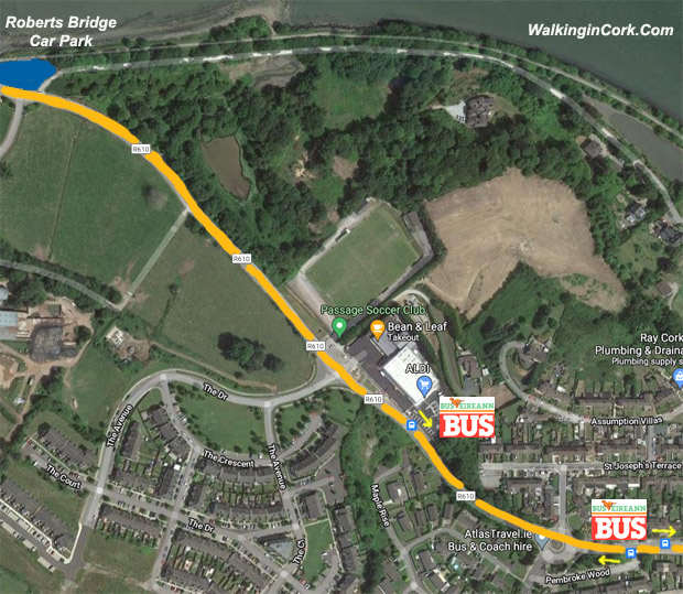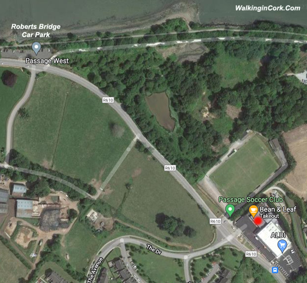 The Roberts Bridge car park is located about 1.5kms north-west of the town of Passage West in Cork Harbour. As can be seen from the map above, it is situated right alongside the R610 road between Rochestown and Passage West.