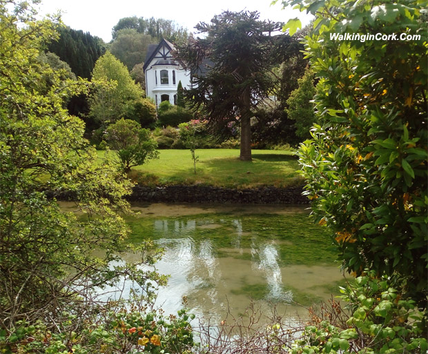 As the pond on the right gets larger, there is a nice view across to an old house called Lee Carrow with an impressive Monkey Puzzle tree in its front garden.